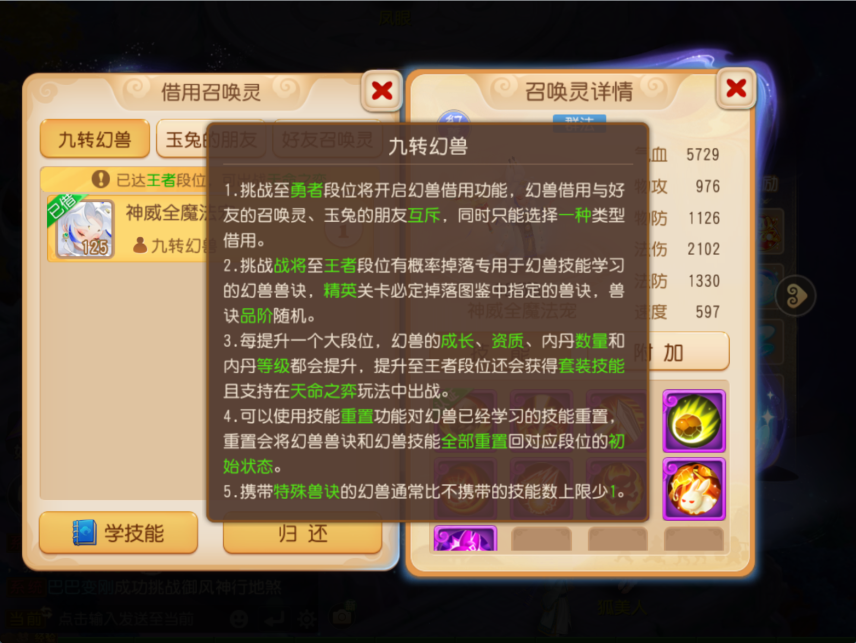 新版九转天阶增加了“九转幻兽”系统,达到勇者段位后解锁。幻兽借用与好友召唤灵、玉兔的朋友互斥,同时只能选择一种类型借用。