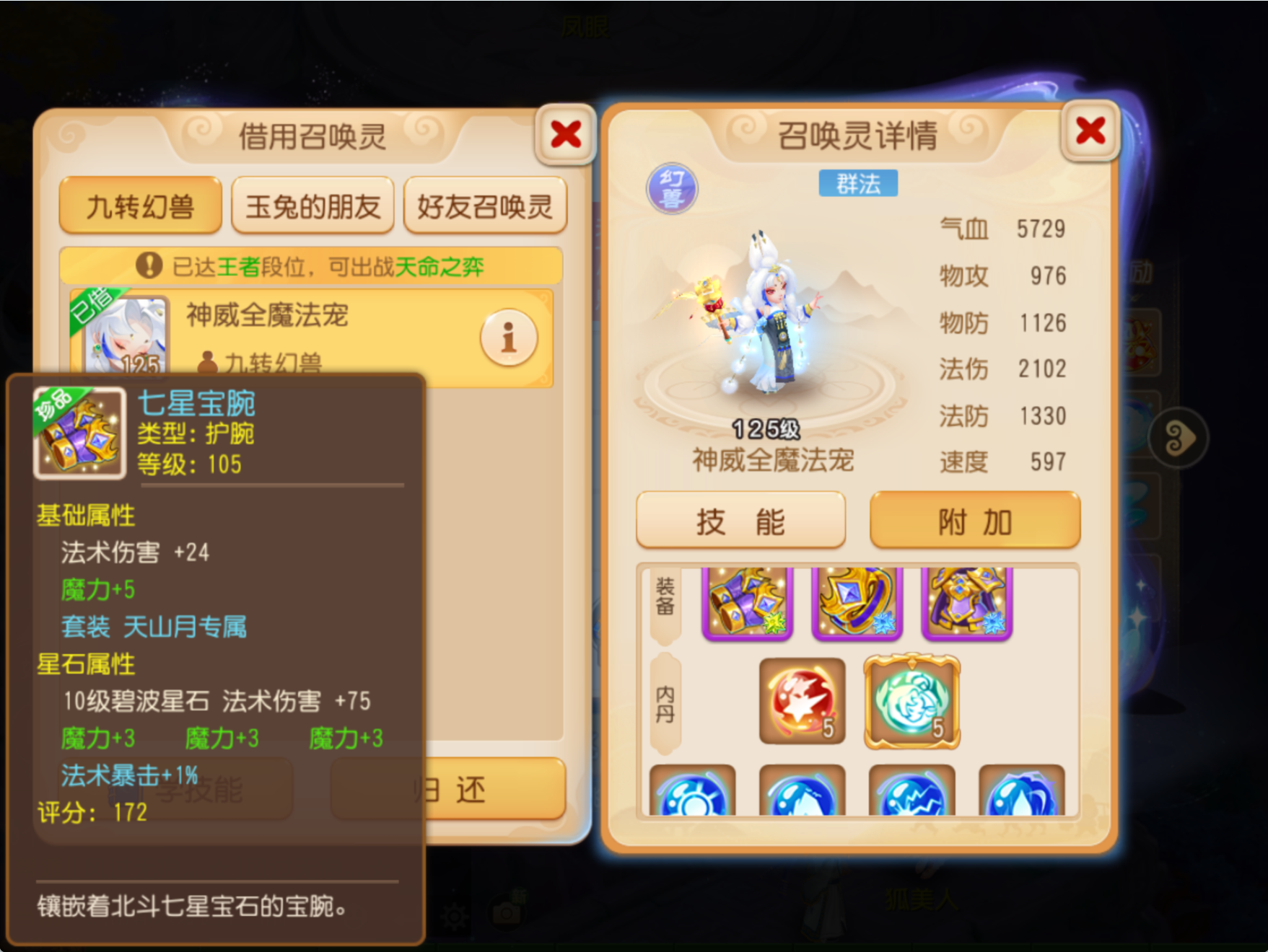 幻兽可以理解为一只“九转天阶”战斗专属的召唤灵,其成长、资质、技能数、内丹数、内丹等级会随着段位不断提升。少侠达到王者段位后,还会解锁专属套装技能,并且该幻兽也可在天命之弈玩法中使用(将在12月24日天命之弈全新S7赛季开启后正式解锁)。幻兽的内丹配置、召唤灵装备及基础属性是固定的,达到王者段位解锁套装技能后便可自动获得对应的星石镶嵌效果。