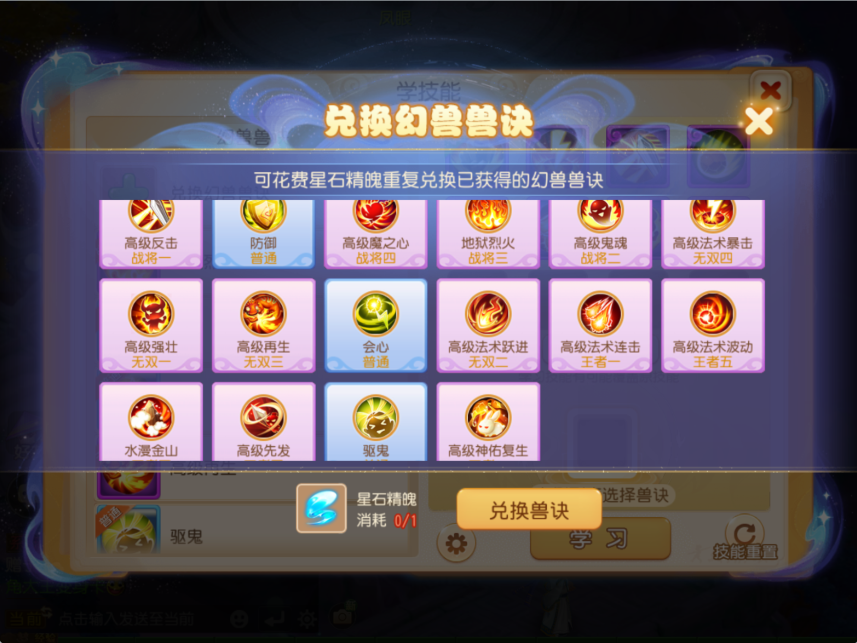 幻兽打书与常规召唤灵打书一致,学习时会随机顶替一个已有技能。当缺少特定兽诀时,玩家可在兽诀商店消耗星石精魄指定兑换。