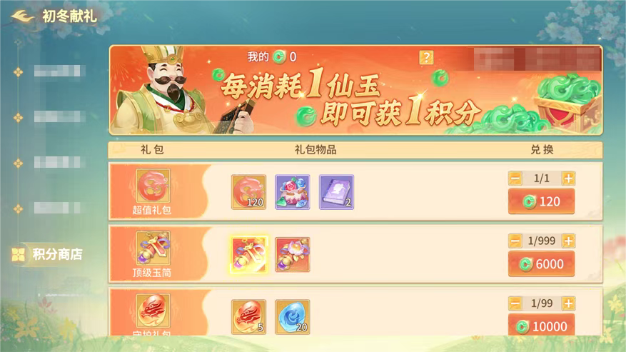 【积分商店】每消耗1仙玉获得1积分,消耗积分可兑换各式礼包好礼,各位修士别忘了去兑换哦~