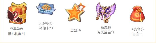 11月6日-12月3日,完成累计签到任务,即可获得:经典角色随机礼盒*1、天梯积分补偿卡*3、星星*9、新魔镜专属星星*1、A皮彩饰盲盒*1奖励!