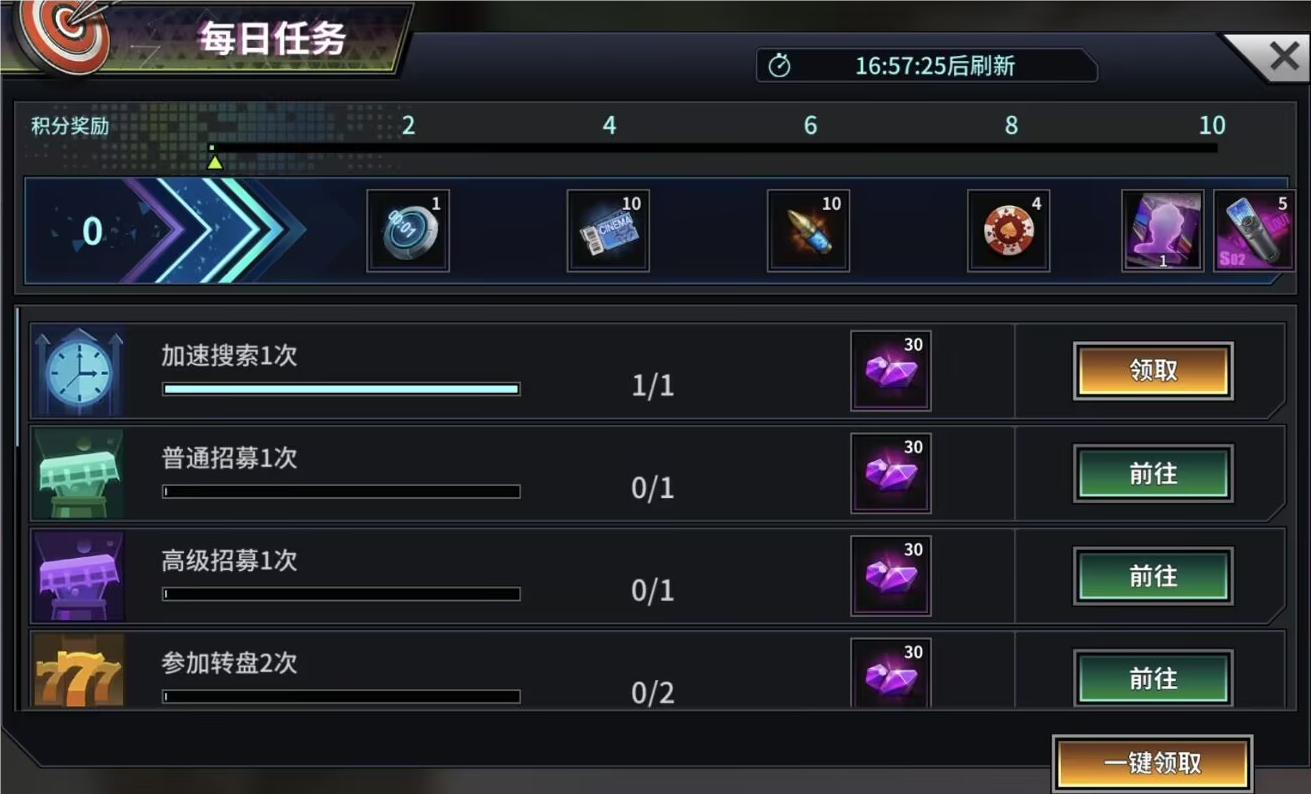 各位探长可通过在边城警视厅完成不同颜色次数任务来领取档位奖励。子弹可用于刷新任务,警徽可用于重置任务。不同任务对英雄的阵营,品级和星级均有不同要求。任务可进行锁定,被锁定的任务不能手动刷新,但每隔24小时会自动刷新。
