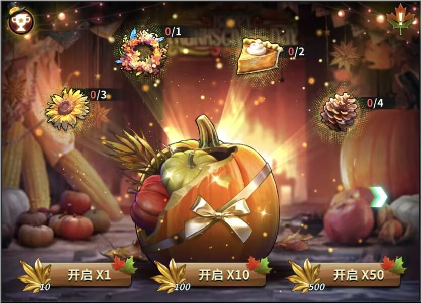 2.2.南瓜分为5种,每种里包含4种道具部件,玩家可消耗对应的金枫叶可以开启对应的南瓜