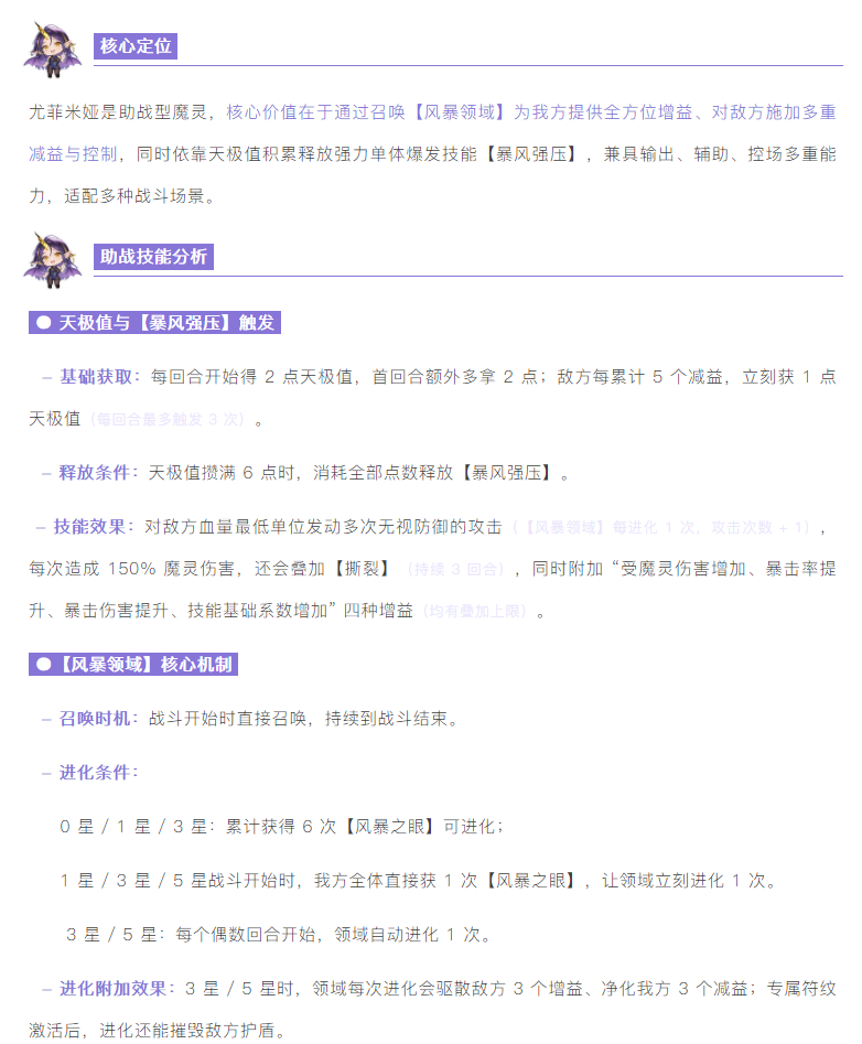 本期攻略为大家带来全能助战魔灵「尤菲米娅」测评!尤菲米娅是助战型魔灵,核心价值在于通过召唤【风暴领域】为我方提供全方位增益、对敌方施加多重减益与控制,同时依靠天极值积累释放强力单体爆发技能【暴风强压】,兼具输出、辅助、控场多重能力,适配多种战斗场景。