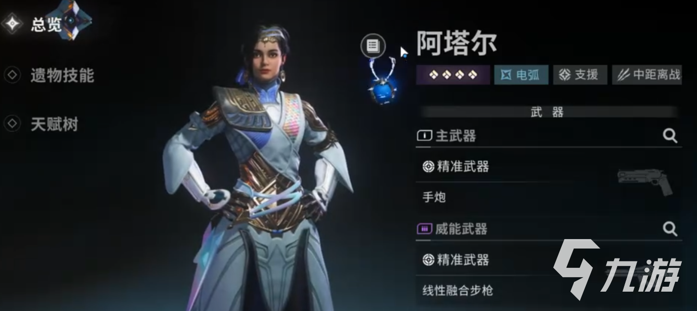 阿塔尔是支援类,她的特技一会发射出一颗电弧飞弹,在敌方之间弹射,造成伤害和平静,多次命中可施加致盲,她的武器精通是在电弧飞弹造成伤害,或者“欢乐搭档”、“出击”施加有效治疗时,都会提升自己的被动能量,当能量满时下一次换弹会为武器弹匣附加小型飞弹,小型飞弹每命中同一目标两次,就会施加使得敌人移动速度降低50%的平静;