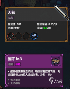 当大家在玩该流派的时候,套装选择完毕后还会直接获得一个叫做无名的法杖,这是套装自带的法杖也是大家需要的法杖,这法杖带有狴犴飞剑和审判之间两个法术,这两个法术就是该流派的核心输出法术。