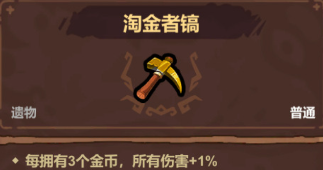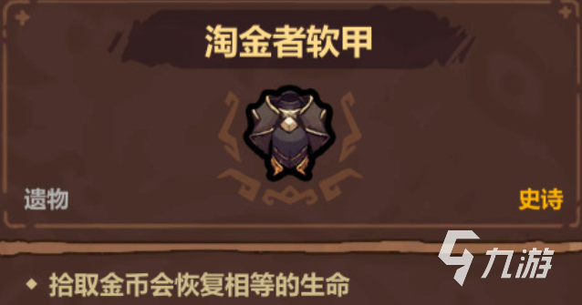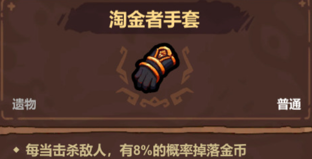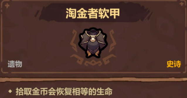 当然撒币之前大家还得足够有钱,为了有原始的积累一定要带上“淘金者手套”和“淘金者金杯”,这两一个击杀怪物后会掉落金币,一个在进入房间时会获得稳定利息,都非常适合攒钱,最后我们还需要注意回复带上“淘金者的软甲”,它的适配度也很高,能在每次拾取金币时恢复等量的生命,这样自己撒币自己捡,理论上能实现无限回血。