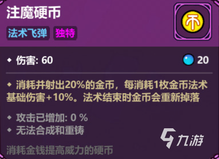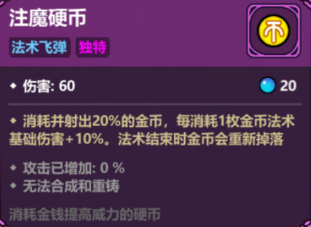 注魔硬币的效果是消耗并发射出手上20%金币,每成功消耗1枚就会让法术的基础伤害加10%,施展完毕后金币会重新掉落在地上可以拾取,当我们手上有金币时,发射出呈现金色,没有发射会呈现银色,大家如果发现变色了就要尽快去捡金币。