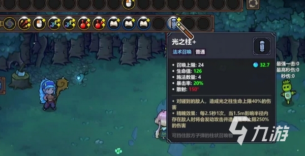 光之柱不仅是召唤物,杀伤潜力也很大。光之柱本身是防御技能,但配合‘脐带’后可以变为毁天灭地的杀器。即使未经强化或星级提升,仅靠基础的脐带连接也能产生每秒约30点的伤害,这在前期就相当可观。