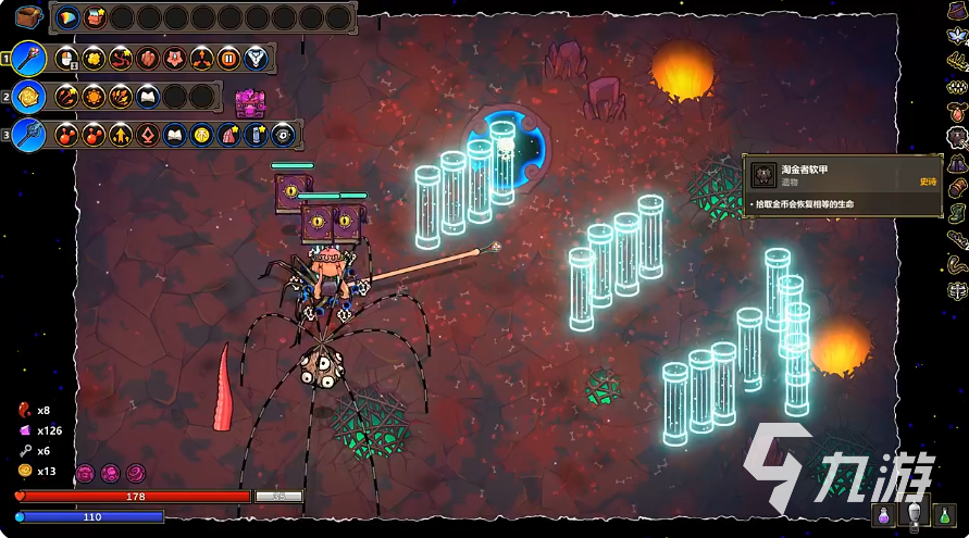 毒蛛之卵:它有三种攻击方式,其一是在原地放一滩毒液,其二是在天上飞行追着角色跑,并喷射毒液,其三施放两个自带毒的滚石;前两种攻击方式并不是非常难搞,绕着墙移动式攻击即可;第三种难度比较大,如果没有召唤物是比较难以躲避的,且滚石留下的毒液也会限制角色的行动,可多准备一些护盾,这样能有效抵挡。第一关整体的难度是比较低的,利用召唤流就能应对,建议新手们优先召唤法术,增强召唤类遗物,也能给后续的关卡打下基础。