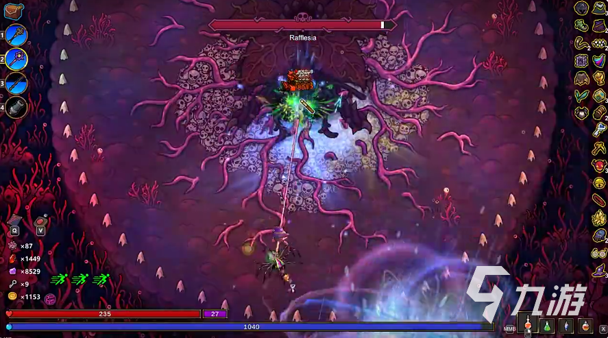 这个BOSS对新手来说是比较有难度的,稍微不注意很容易死亡,它在半血后就会隐身,同时还会释放出比较密集的弹幕,对萌新不太友好,但是它被召唤物克制,召唤物直接无视它隐身,并能抵挡弹幕攻击,蝴蝶也能对其进行追踪。