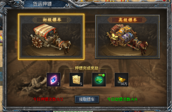 每天开启,把镖车护送到指定地点,途中可能遭遇其他玩家劫镖,需要小心防范。成功送达后,海量福利、海量经验到手,是获取经验的主要来源之一。