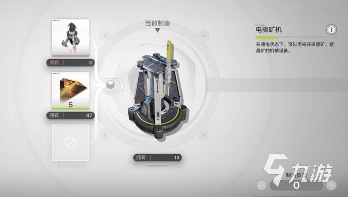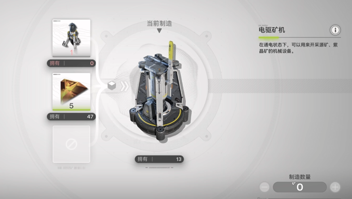 在基建过程中,我们可以直接使用原来的便携源石矿机和5个晶体外壳合成一个电驱矿机,可以看到材料要求还是比较少的。到游戏的中期获取到更多工业点数去解锁是高级矿物采掘就能够解开二型电驱矿机的限制了,到时候可以用材料将手上的电驱矿机升级强化,从而让我们能够采掘更加坚硬的矿物,而且还可以大幅提升采矿的速度,还是比较不错的。