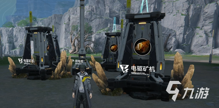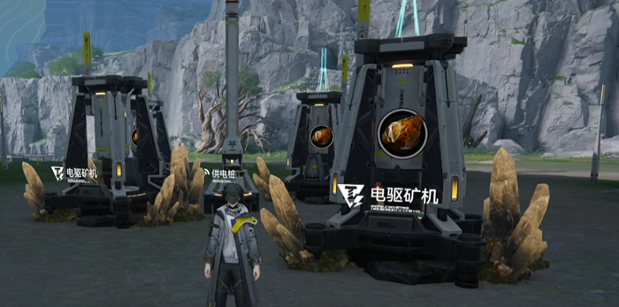 这种矿机不需要供电就可以持续工作,但是只能采集到一些比较低级的矿物,而且储存量有限制,满了之后就无法继续开采,需要定期收取。想要使用电驱矿机和加强版的二型电驱矿机则需要在附近配备供电桩,但是带有无线传输功能,可以直接将产品送到仓库里。跟随主线任务解锁空间模拟器之后就可以获取到一定的工业点数并且解锁中级矿物采掘。此时也就是真正解锁了电驱矿机并且能够生产制造。这里需要我们在相关教学中进入电驱矿机的模拟空间,主要就是在三台矿机之间放置供电桩并且使用中继器来通电,用以驱动矿机。