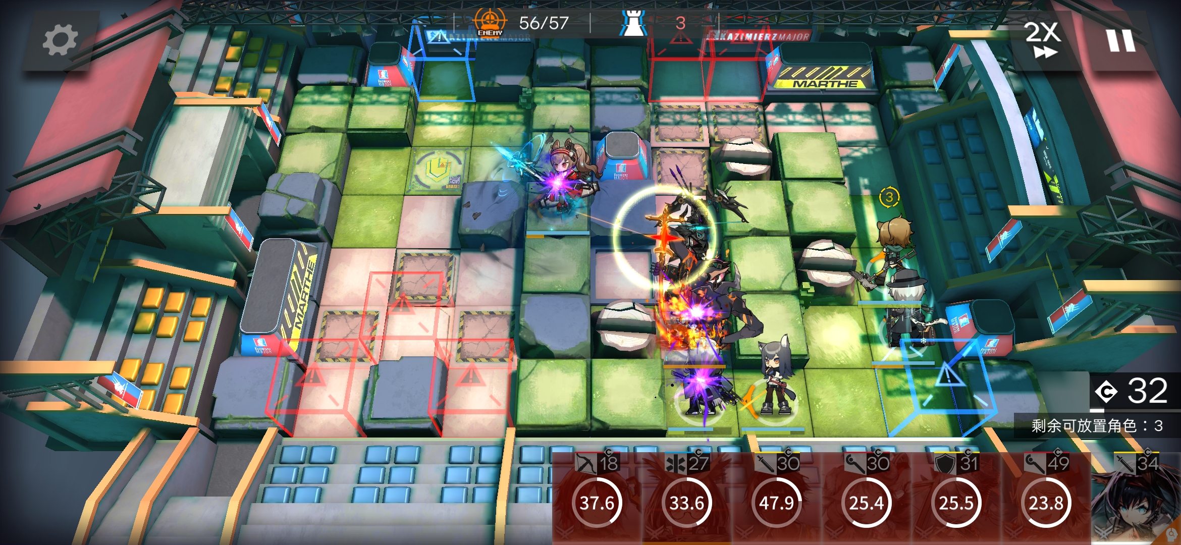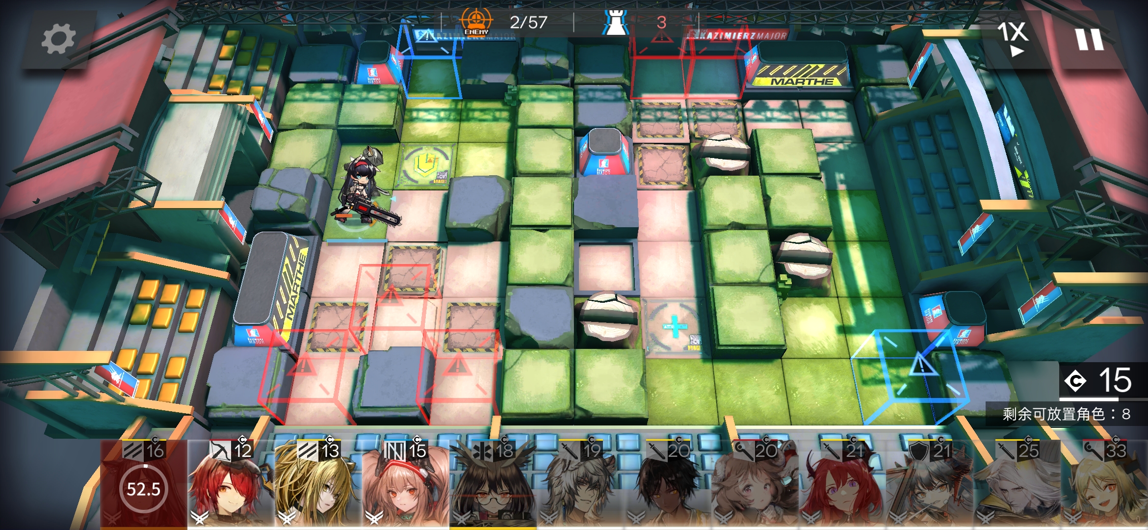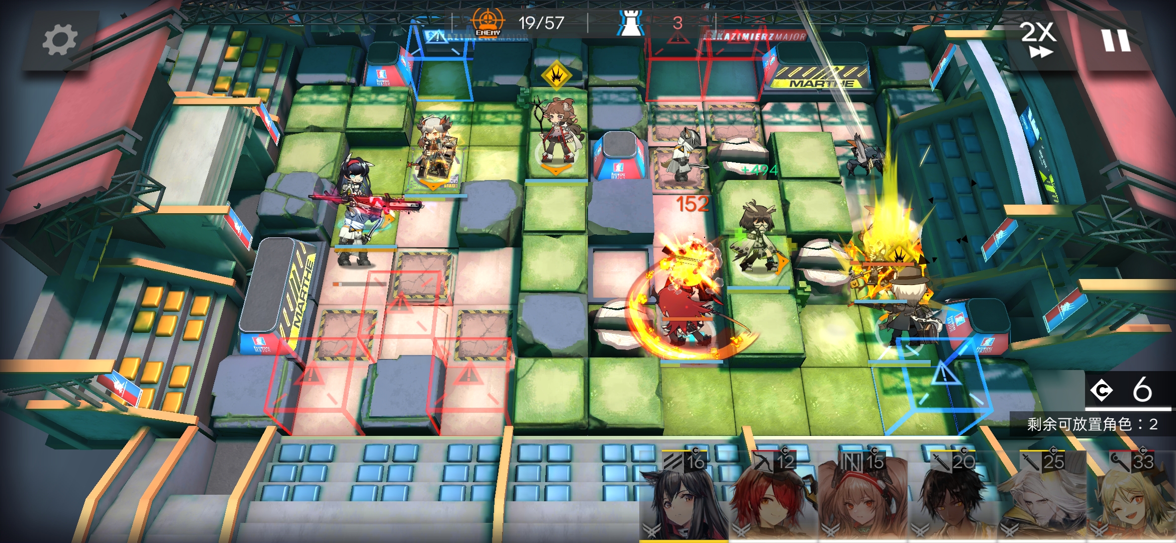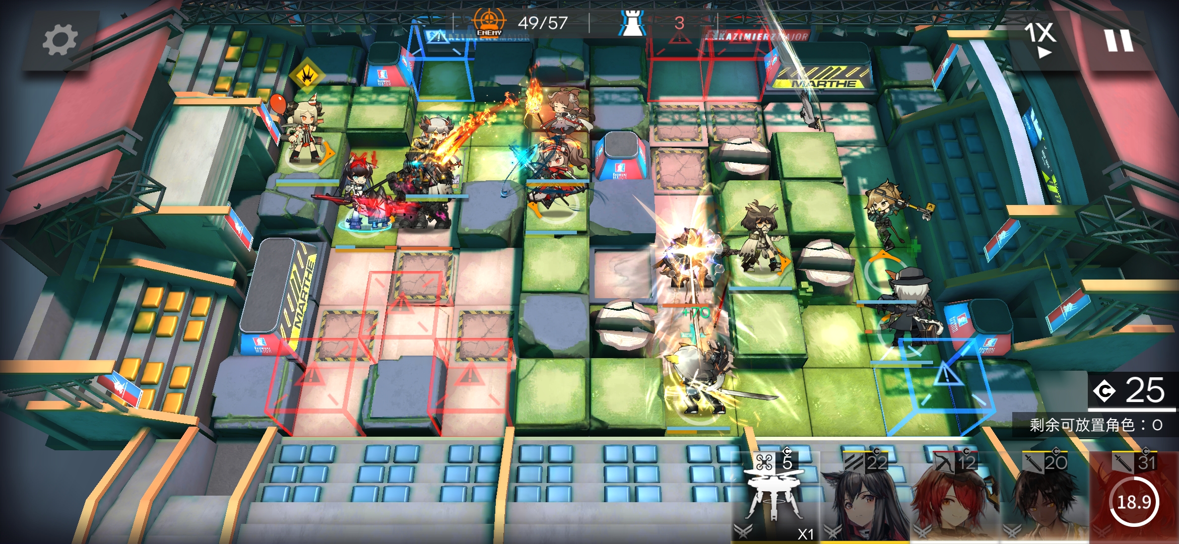同时,相对于高等级合约需要的近卫干员,我们可以布置较强的先锋干员来单独守住右边通道,只要给予及时的医疗就好。