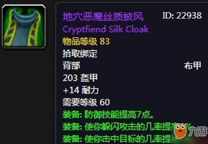 魔兽世界怀旧服地穴恶魔丝质披风怎么得?地穴恶魔丝质披风可以提高防御技能等级,躲闪攻击的几率,击中目标的几率。那么怎么获得呢,一起来看看吧。 魔兽世界怀旧服地穴...[详情]