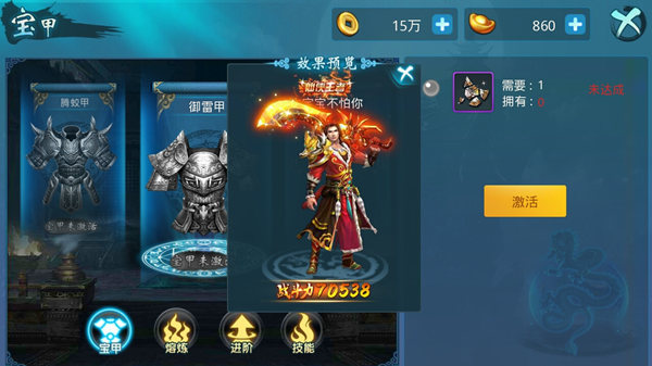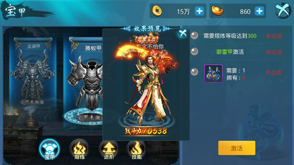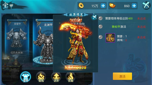 只要我们通过守卫剑阁得到一个一阶宝甲激活碎片后就可以激活宝甲,即使还没有宝甲形象,我们依然可以通过熔炼,对自己角色进行属性加成。
