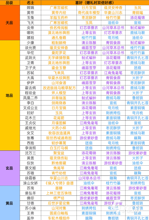 礼物能带来好感度的加成,投其所好的赠送能带来额外的加成,不知道送什么的可以跟着下图来,当好感度到一定阶段的时候,名士会赠送我们珍贵的资源当做回礼,所以手上有礼物一定要记得去赠送。