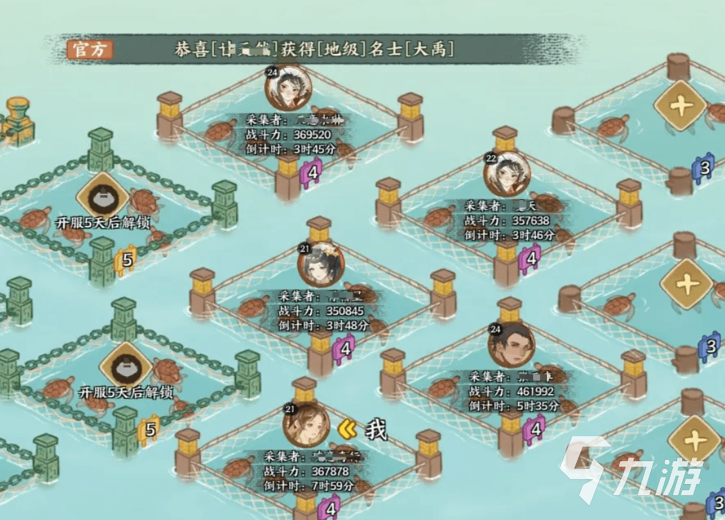 首先龟甲的获取主要是通过龟甲海域和饲龟池,龟甲海域在进入后会被自动分配不同的海域,每一处都有35个龟甲采集点,采集点按照级别会被以此分成1到7级,级数越高产出的数量也就越多,玩家最多可以派遣3支队伍入驻采集,每一个点位会有累积的采集上限,到时间就会自动收取并返回。