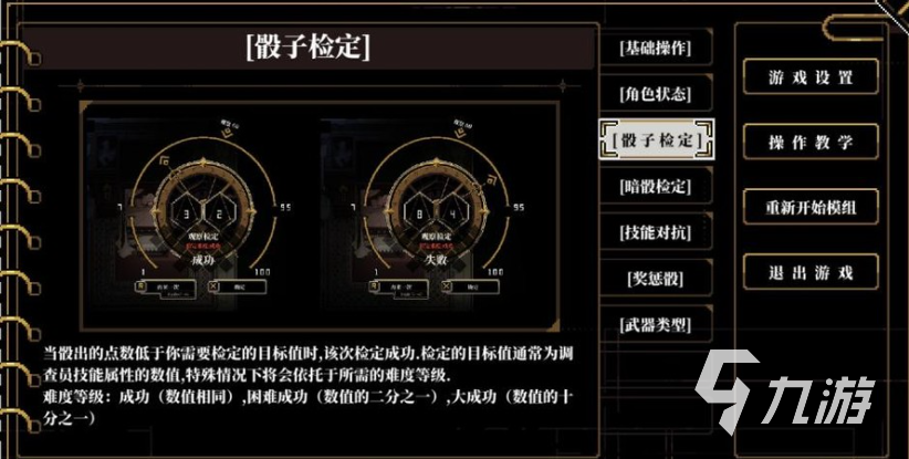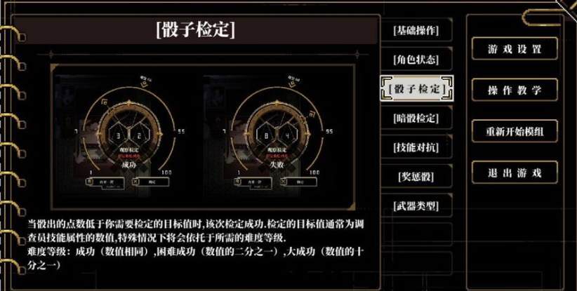 游戏的跑团核心机制是比较有趣的。单骰规则相对简单,总而言之就是越小越好,例如神秘学技能数值是40,翻看古书投币39就算成功,41就算失败。游戏会简化投骰子结果的分区只会分成四大类型。技能对抗主要是指双方攻击和防御属性一起去投掷。例如偷窃时隐匿属性就可以对抗对方的观察属性,而如果对于结果不满意,玩家也可以用幸运值去逆天改命。