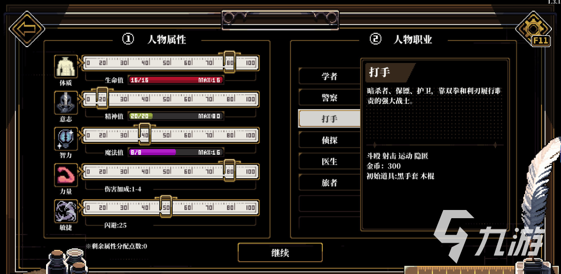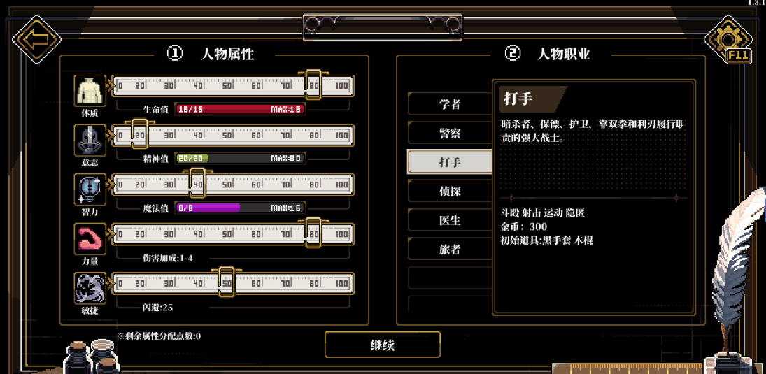 这款游戏是很好玩的,首先就会有较高的自由度,玩家可以自由的创建角色。从打手、从侦探、从警察等多个职业中去做出选择。每一个职业一开始属性和上限都会有所区别。例如打手的战斗能力初始数值比较高,知识类相对比较弱。警察可以用三连发的手枪之后,玩家就需要去分配基础的属性,包括决定血量的数值。在属性分配上敏捷是比较关键的,毕竟在回合制战斗中,先手还有闪避,往往都可以左右战局。