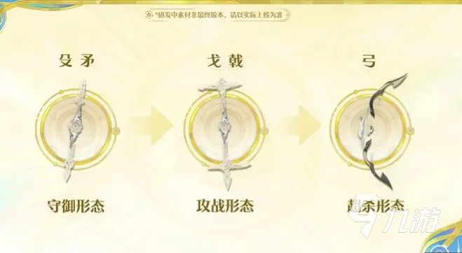 攻战形态:更适合中距离展开战斗,1技能”戈锁九泉“,使用戈钩对终点方向位移。2技能"戟荡八荒",对前方对手进行范围横扫,也能附加回复效果,增强她的续航能力。超杀状态:擅长远距离战斗。