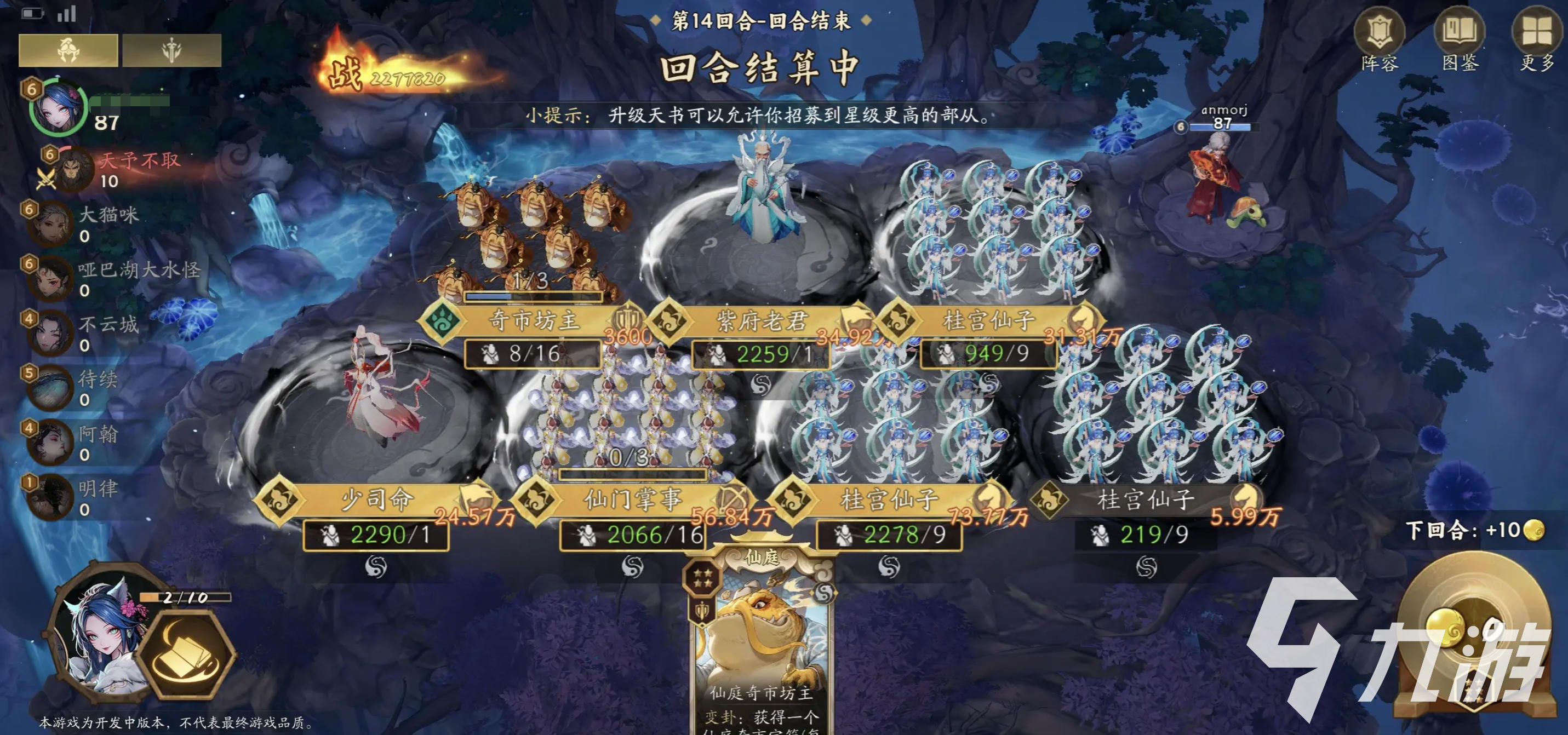 纯黑流的核心则瑶池仙子与除魔剑客。前期同样通过基础弟子过渡,但进入中后期后,瑶池仙子、除魔剑客、救苦仙尊以及太白金星能够不断触发寻踪效果,大量刷出黑卦以快速提升战力。天罡星君在这里依然是不可或缺的关键角色,他能在转两仪之后让黑卦的刷新效率进一步提高,甚至在阵容成型后直接替代雨师仙子。纯黑流的玩法节奏感更强,战斗中核心就是“不断刷新,不断增强”,而幻神选择狐仙会让阵容的稳定性和续航能力更好。