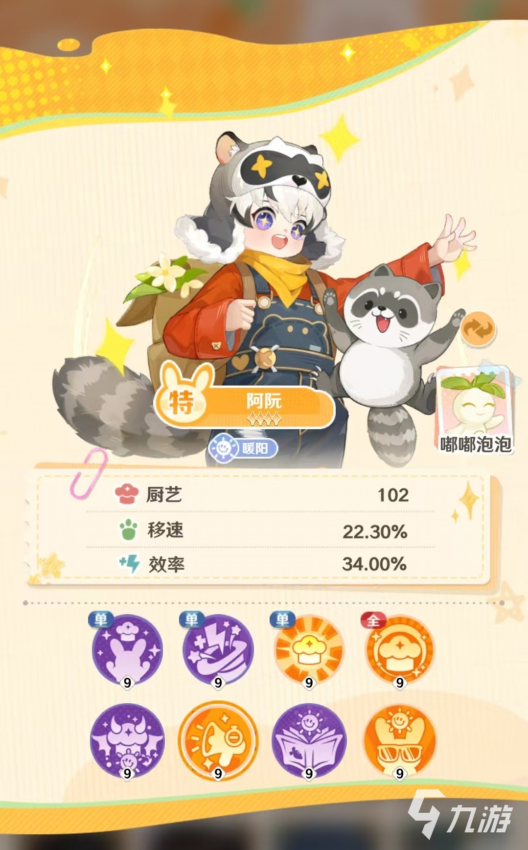在自身厨艺方面,阿阮具有的单体技能厨力全开属于三级效果,能够提升13%的自身厨艺属性,在工作位置就能生效。第2个被动是单体技能魔力妙手,也是三级效果,经营店铺时,提供提高13%制餐效率。第3个是二级的宇宙小爆发,只需要入座率达到80%就能激活,增加400%自身移动速度和40%的效率,持续90秒钟。