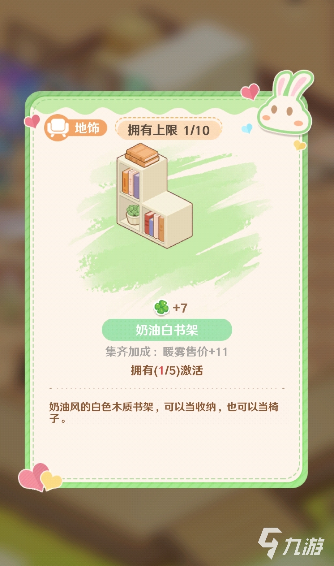 此外,在家具图鉴中,玩家可以查看所有能打造的家具,并从描述中推测出所需材料的偏向。比如“奶油白书架”的说明里写着“奶油风的白色木质书架”,就能看出其主要偏好为木材,玩家可以通过分析这些家具描述,选择自己材料使用的方向。