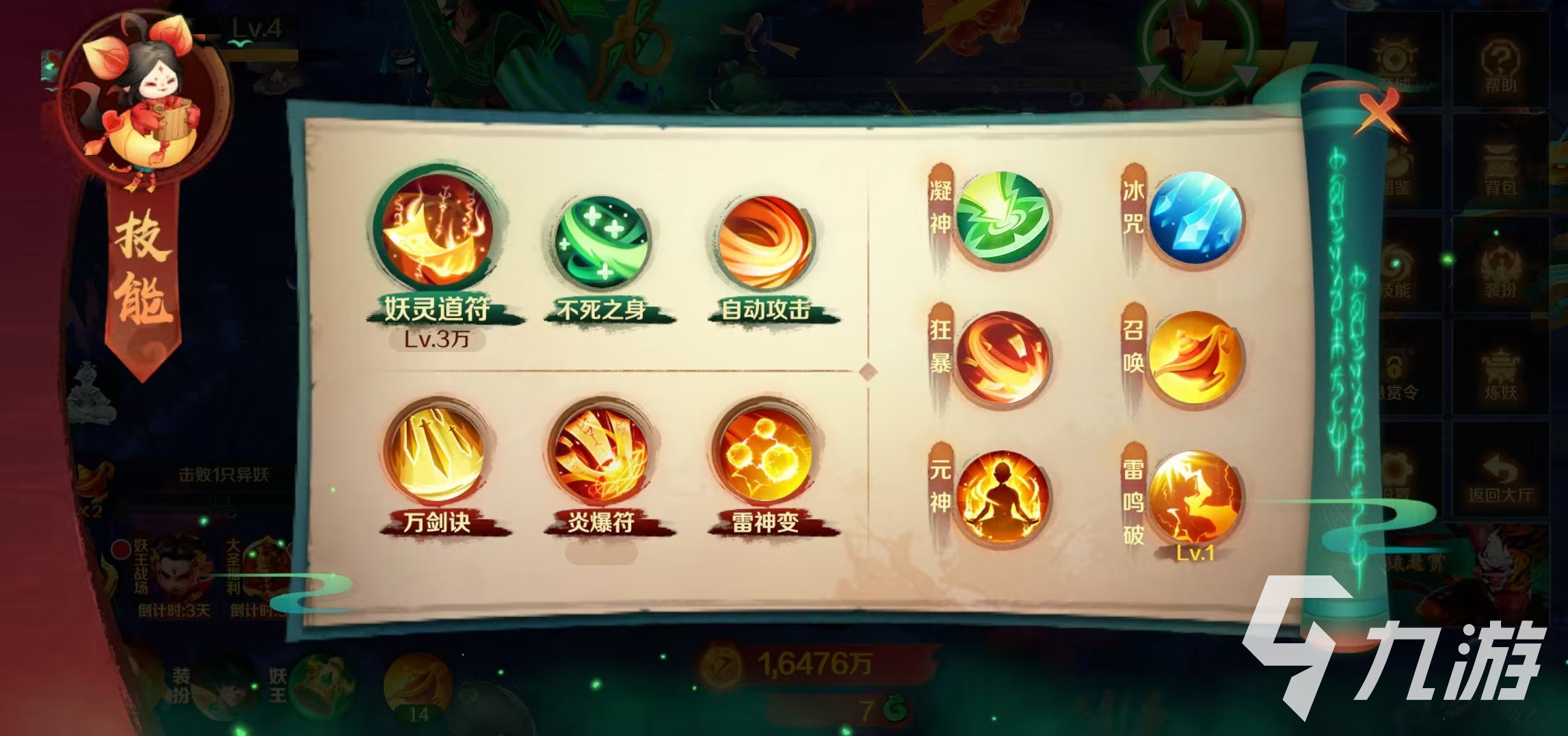 大家在战斗的过程中也要注意一些技巧,首先是技能搭配,在面对数量众多的群体怪物时,选择一些范围伤害高的群攻技能,在面对boss时,就改为控制和单体高伤害技能。灵活运用闪避技巧躲避敌人的攻击,在敌人攻击落空的瞬间抓住机会进行反击。道符升级主要是通过挂机战斗、完成任务和活动等方式来获得经验,提升道符等级后便于击杀更强大的敌人。最后是要积极参与炼妖玩法,击败大妖数量达标后可以进行炼妖,有机会刷新奖池,获得大量妖灵奖励。