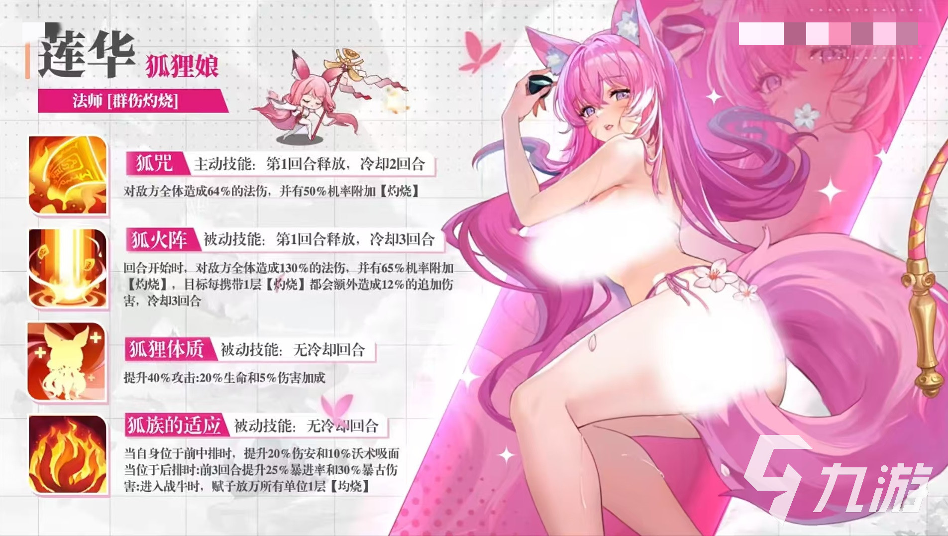 第2个技能狐火阵,第一回合直接释放,冷却时间三回合。在回合开始时,对敌方全体造成130%的法术伤害,并有65%的几率附加灼烧。目标每携带一层的灼烧层数,都会额外造成12%的追加伤害,冷却三回合。这个技能就将莲华的伤害提升了起来,叠加起层数之后,仅仅是附加的追加伤害就已经非常可观,是莲华的主要输出技能。第3个技能是被动效果狐狸体质,提升40%攻击,20%生命和5%的伤害加成。这个被动对于莲华整体的输出提升有着重要的作用,所以这是一个很有培养潜力的角色。