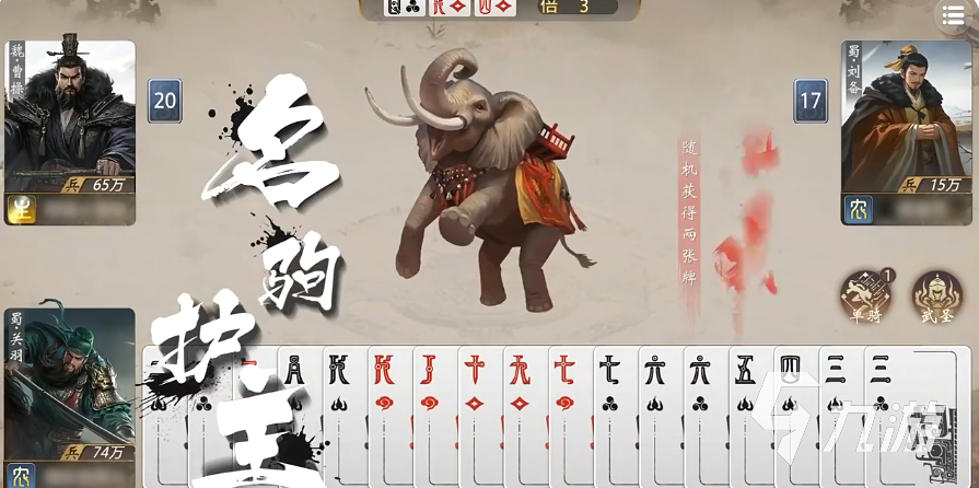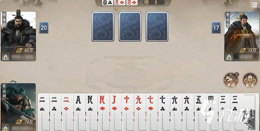 基本玩法和大家接触的类似斗地主,一轮对局有三人展开对战,其中一个人就相当于“地主”,最多可以拿到三张牌,区分为两个不同阵营,那一方将牌先出完,就能获得本次对局胜利,但是和传统打牌又有很大区别,这里有卡牌以及武将元素的加入,这也是其中比较核心的部分。