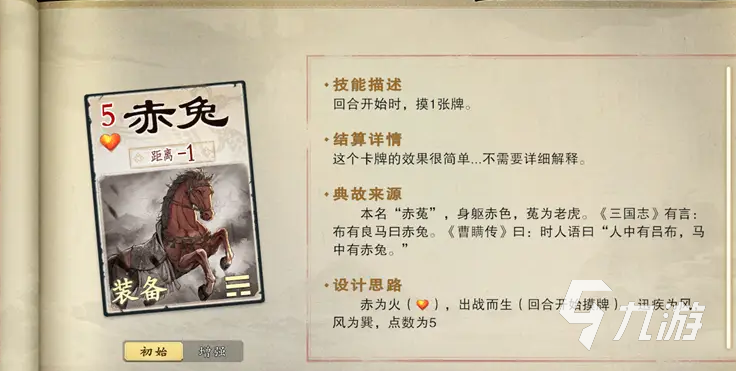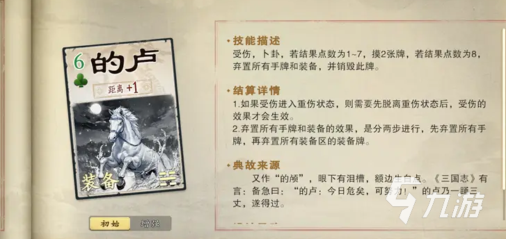 的卢能在装备者受伤的时候,进行卜卦,若结果是1到7能摸两张牌,如果结果是8会弃置所有手牌和装备,的卢也会销毁,如果受伤进入重伤状态,需要先脱离重伤才能让效果生效。