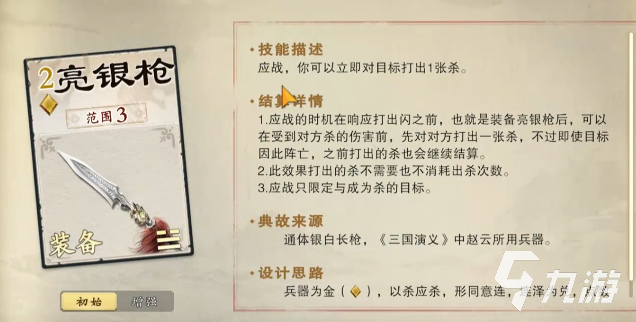 亮银枪可以在成为杀的目标时,立刻对目标打出1张杀,简单来说就是在受到对手杀伤害前,只要我们装备就可以先对其打出一张。