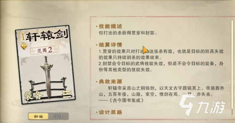 轩辕剑会让手中的杀得到封禁和贯穿效果,贯穿可以无视敌人的防具,封禁会让目标在本回合内不能使用武将技。
