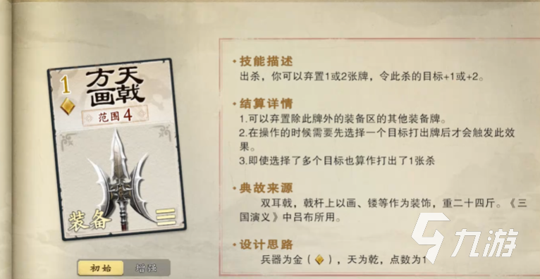 方天画戟能在出杀时,可以通过弃置1到2张牌,让攻击的目标数量加1或2。