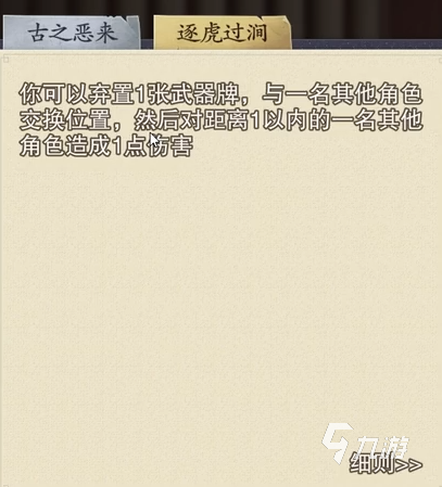 第二个技能是猛虎过涧,此技能需要咱们舍弃掉一张武器牌然后发动。在发动后我们可以和其他的一名玩家来交换位置,然后可以对1距离以内的其他角色来造成1点伤害。