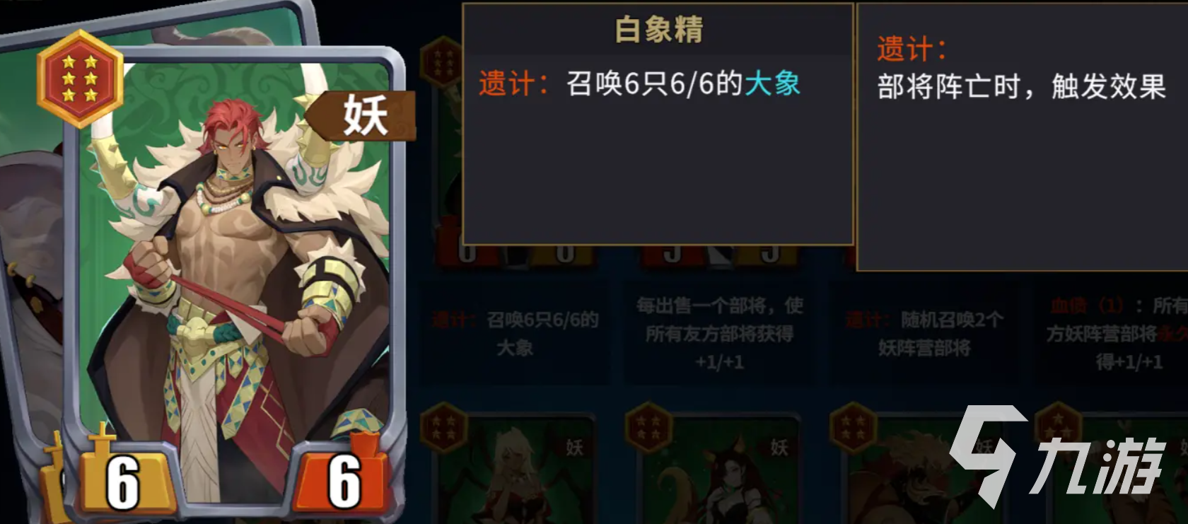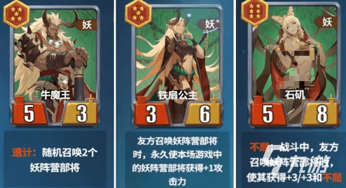 妖阵营的核心就是围绕“召唤”来构建的,可以通过远远不断的召唤来以多打少,队伍的核心石矶可以给召唤物施加“不屈”,让它们的生存能力直接翻倍,铁扇公主能在队友召唤时,让他们永久获得加1的攻击力,是目前养召唤物最为有效的方式,牛魔王的能力是随机召唤2个部将,也就是说既可以召唤出银角、白象来让他们继续上场召唤实现套娃,也能召出玉面狐狸等补强战力的卡;