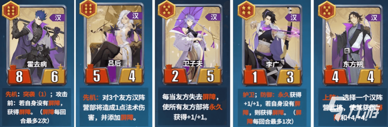 屏障流的核心思路就是围绕着“屏障”机制来构建的,队伍中的卫子夫能在队友失去屏障时让他们属性永久提升,从而养大全队的属性,同时还能充分利用屏障抵挡伤害的作用,来实现无伤的碰撞,队伍的吕后会对3个队友造成法术伤并添加屏障,也就是实现主动的破盾和套盾,霍去病是主攻手,有机会抢先手,概率击杀对方的核心,并且还能自主套盾攻击防御都有,李广是有着不错的坦度和成长机制,东方朔是全队永久施加“屏障”的关键;
