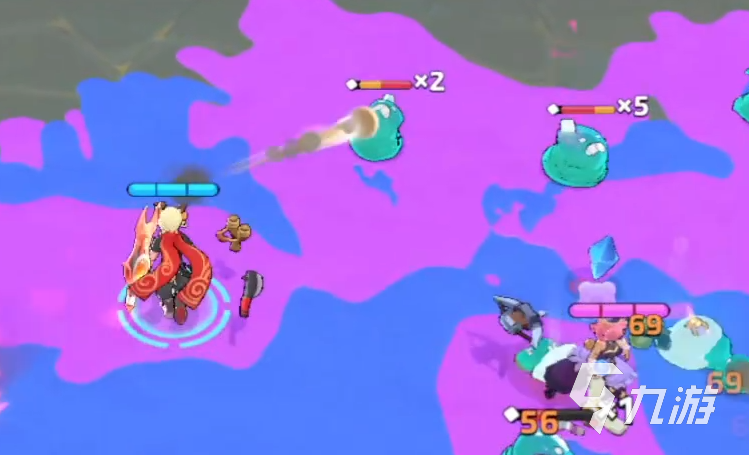 此次的游戏最为新奇的便是涂鸦玩法。这也是游戏里面玩家们对决的主要模式,我们所在的场景里面会不断的刷新敌人,在击败这些敌人之后便会在场地留下颜料,哪一方留下的颜料更多,便可以获取到胜利。