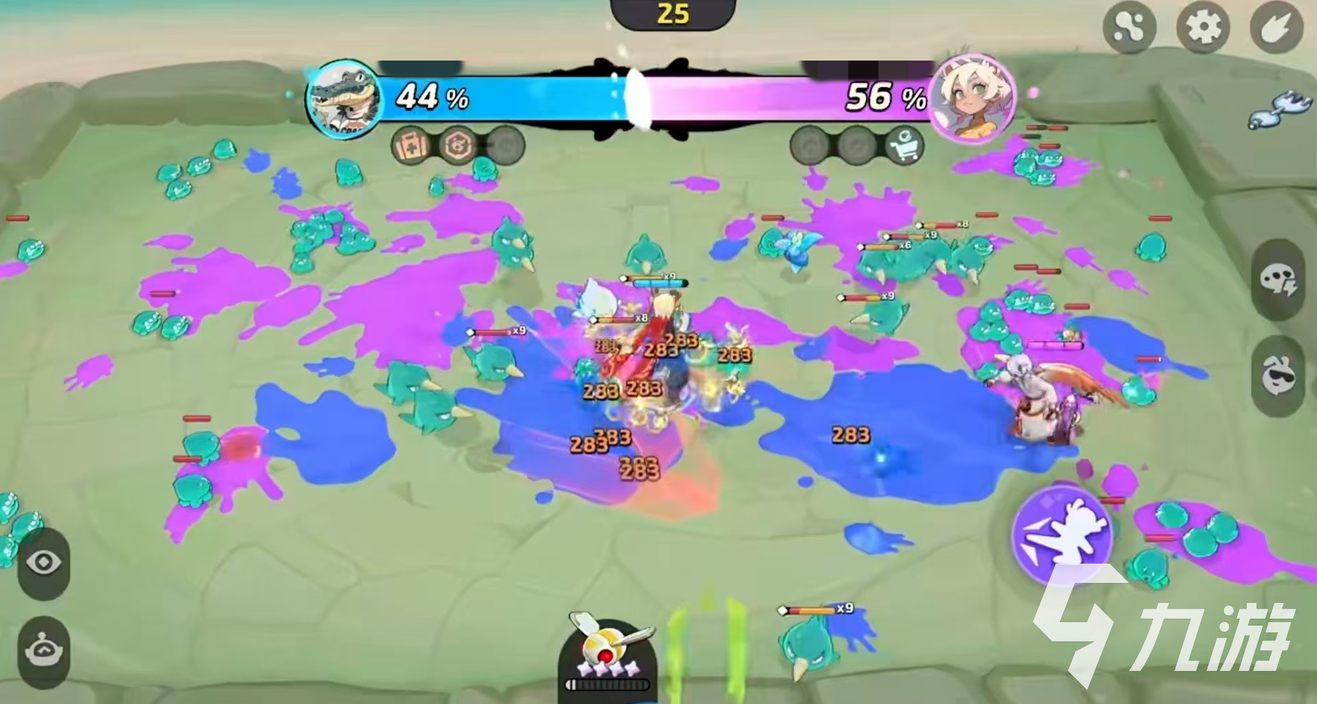 这款游戏拥有自身独特的核心玩法,采用涂色占比的方式来确定胜负,玩家只需要击杀小怪,就可以扩大己方的涂色范围,这样的设定就大大区别于传统的对战模式。武器获取的方式也非常新颖,系统会根据根据玩家的血量高低排序,然后进行分配,玩家用钩子抓取就可以直接使用,这样的设定也增加了玩法的策略性。该游戏融合了涂色对战、弹幕射击和肉鸽等元素,玩家既要在弹幕中进行极限走位,又需要通过肉鸽式的武器和强化科技选选择,构筑出一套比较独特的战斗流派,这样能够在策略对抗和操作快感之间找到均衡。