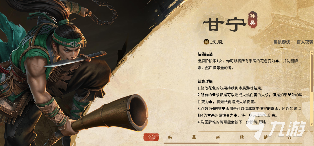名将杀的拆迁队玩法主要用到的角色是甘宁和大乔,其中甘宁是核心角色,他的核心技能奇袭能够直接弃掉敌人的卡牌或者装备,快速的降低敌人的战斗能力。此外,奇袭能够在比较短的时间内打乱敌方布局,尤其是在敌人手里有着比较强力的装备牌,又或者是较为关键卡牌的时候,能轻松的摧毁。