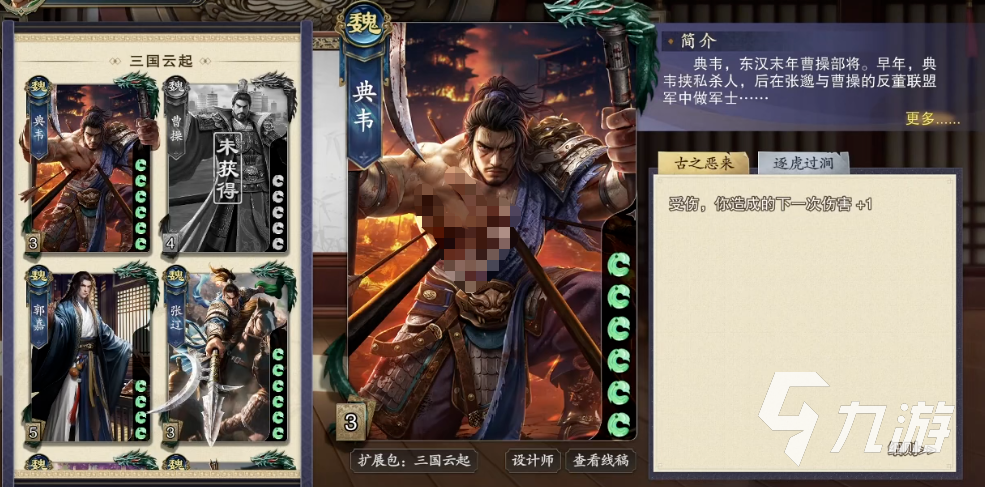 典韦的一技能古之恶来是主要输出,能够在典韦受伤时把下一次所造成的伤害加一点,简单理解,就是以伤换伤,在劣势局可以快速达到反击效果。如果将该技能和增伤类的卡牌又或者是武器一起使用的话,那么单轮的爆发就能够对血量比较高的敌人造成威胁。