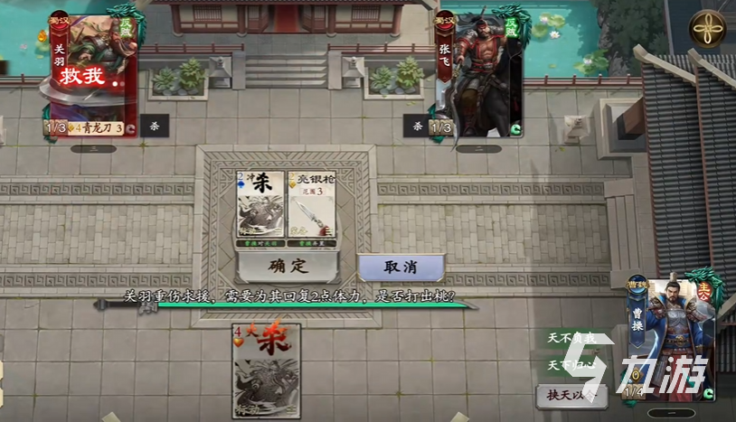 需要装备方天画戟,对关羽出杀牌,弃牌可以触发装备的特效,能额外选定张飞为目标,之后获胜。