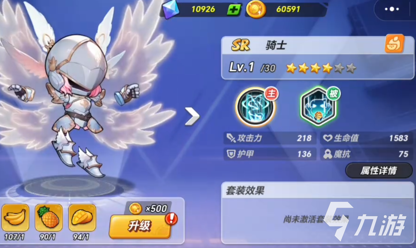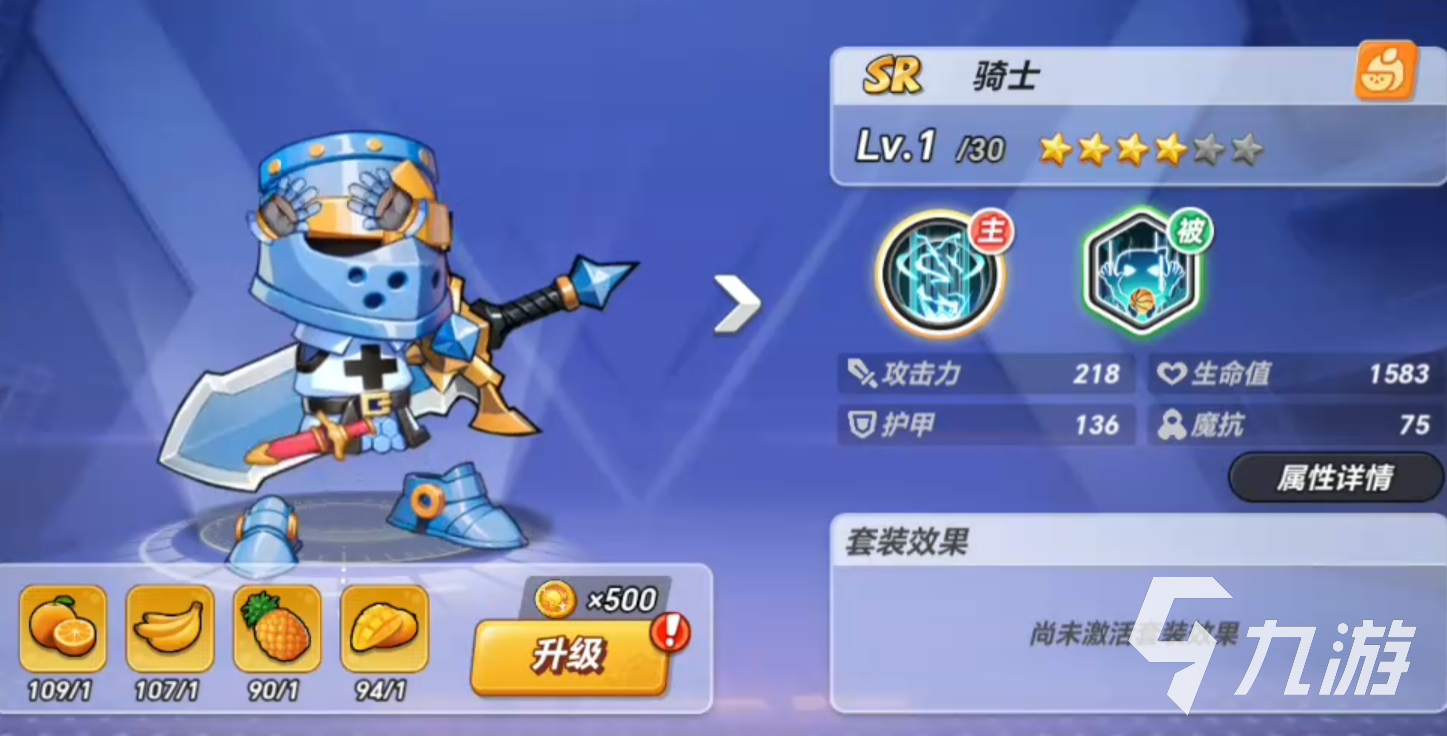 骑士属于一个SR级别的角色,有着高额的基础成长属性,能够带来强大的防御力以及生命力,当然攻击能力同样不俗。戴上了银翼骑士皮肤之后,显得更加帅气了!宛若天降的天使一般,仿佛能给予敌人致命一击。想要变得更强的话,就可准备各种水果材料,即可进行快速升级!