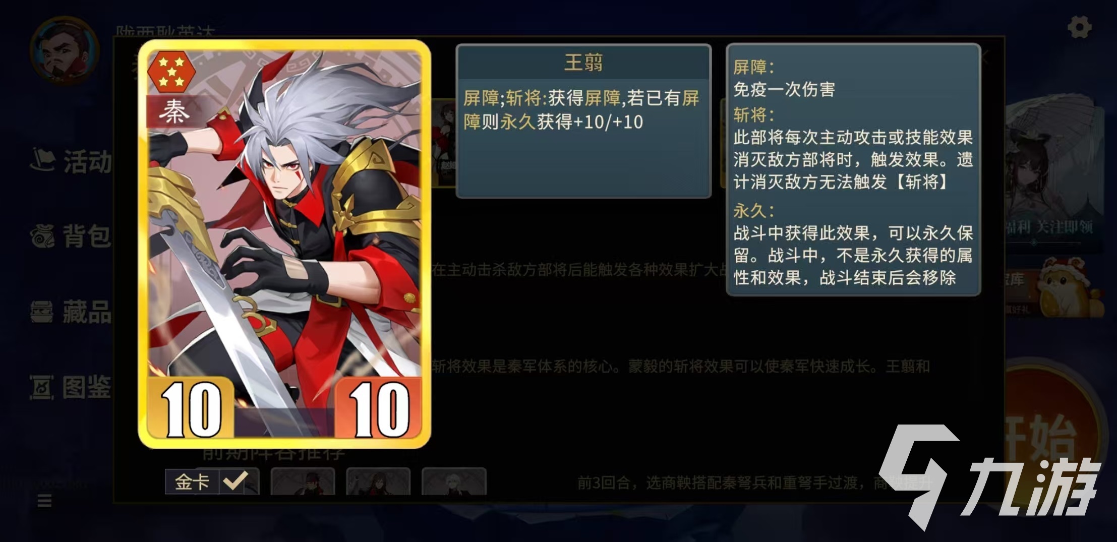 目前游戏中的主流玩法包括秦阵营斩将流、汉阵营屏障流、唐阵营鼓舞流、妖阵营爆发流和中立玩法这几类。秦阵营斩将流的核心卡牌是蒙毅、白起、王翦、商鞅、芈月等。其中商鞅和蒙毅奠定了斩将属性基础,白起和王翦利用自身的高额伤害和属性成长,实现快速清场,芈月的作用在于进一步放大敌方死亡触发斩将的联动机制。整套流派搭建起来之后,可以实现斩将、清场,然后再斩将的循环压制,令对方毫无还手之力。