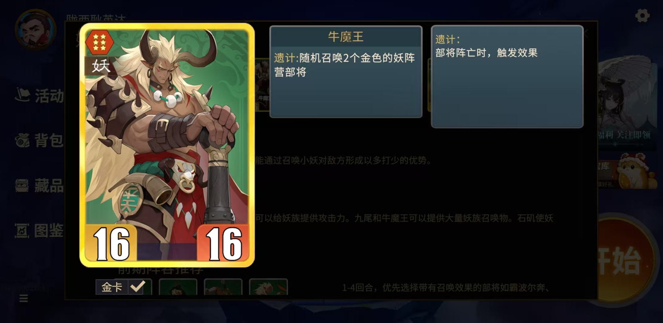 妖阵营爆发流的核心卡牌包括牛魔王、白骨夫人、铁扇公主、红孩儿等。红孩儿和铁扇公主给全局带来攻击力打底提升效果,石矶和白骨夫人可以触发连锁,然后白象精和牛魔王的遗技召唤,能得到大量高属性妖族部将。这样形成快速铺场,然后对敌方实现属性碾压,爆发起来非常恐怖。中立玩法则比较百搭,核心卡牌可以选择青龙、白虎、混沌、麒麟等。麒麟的全局属性成长适配大多数阵容,青龙、白虎,可对上阵后勤等类型技能的收益进行放大。日巡带来的是护卫体系的坦度强化效果,混沌可以复制核心卡的技能,并且叠高自身属性,作为万能补充,可以融入到任意阵容的体系中。
