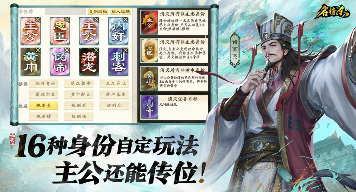 游戏中的身份选择上还是很丰富的,包含了主公、忠臣、反贼、内奸等多种,且有着伪帝、黄巾、潜龙、刺客等特殊身份的加入,让玩家的策略对抗也变得更加有趣,每局的胜利条件因身份的不同,到时的要求上也会有很大的差异哦。比如游戏中主公阵亡后可指定一名角色继承身份并获得额外手牌;而黄巾势力被非主公击杀时,击杀者可获得奖励卡牌等。