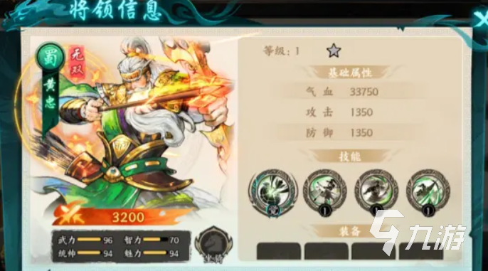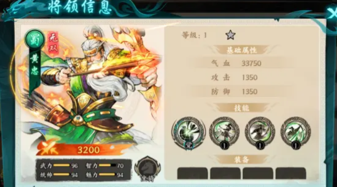 黄忠射出的箭能造成大量随机的群体伤,并且有降低怒气和破甲效果,他的大招“烈弓穿云”会射出8支利箭从天而降攻击随机敌人,他的被动会在敌军每阵亡1名将领的情况下,增加攻击力最多能叠加5次,持续到战斗结束,他的“石破天惊”会让大招发射的每一支利箭有40%概率无视敌方35%防御,或降低目标100怒气。