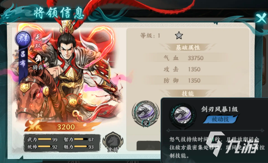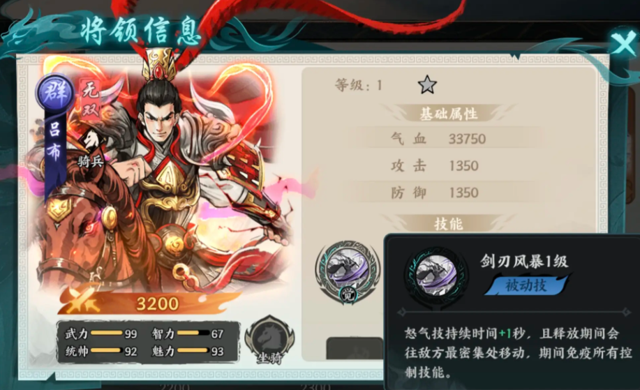吕布是输出骑兵,伤害范围可观,搭配能附加麻痹的武将能打出更多连携伤,他的怒气技“神鬼乱舞”会持续并快速挥舞武器,对周边3圈范围内的所有敌人每0.5秒造成一定输出,他的被动能在有任意敌人获得麻痹时,投出鬼戟攻击该目标,他的“剑刃风暴”会让怒气技的持续时间增加1秒,并且释放的期间会向着敌方最密集处移动,在期间能免疫所有的控制。